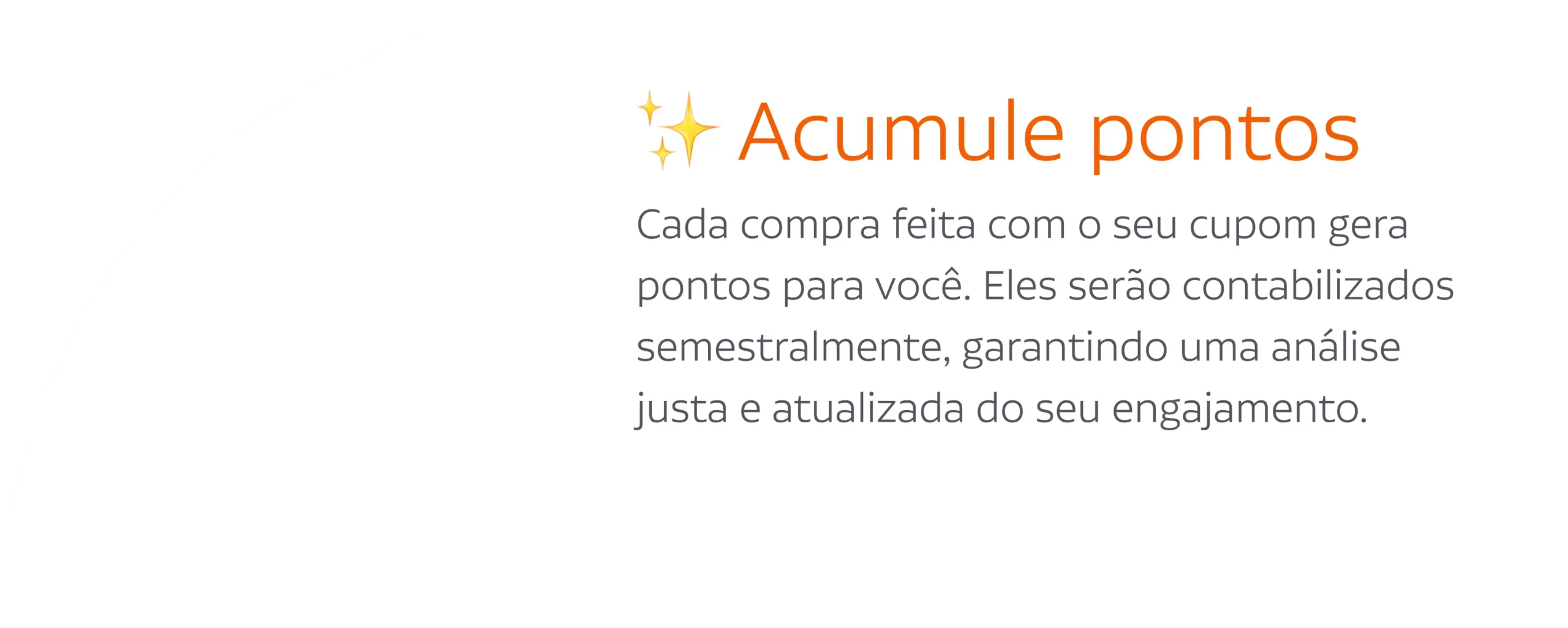 Cada compra feita com o seu cupom gera pontos para você. Eles serão contabilizados semestralmente, garantindo uma análise justa e atualizada do seu engajamento.
